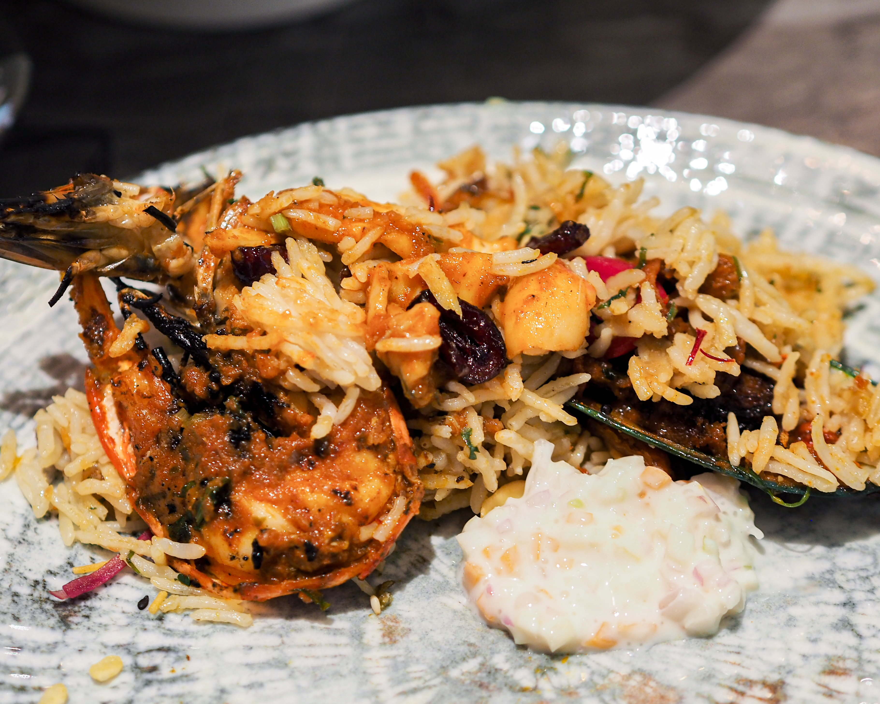 Pair the rice and seafood with the accompanying green apple raita (very good!) and mango pickles to cut through the richness of this flavour bomb. I really appreciate a well-prepared biryani with fluffy rice and the right balance of spices, herbs and a touch of sweetness from both dried fruit and fried onions.