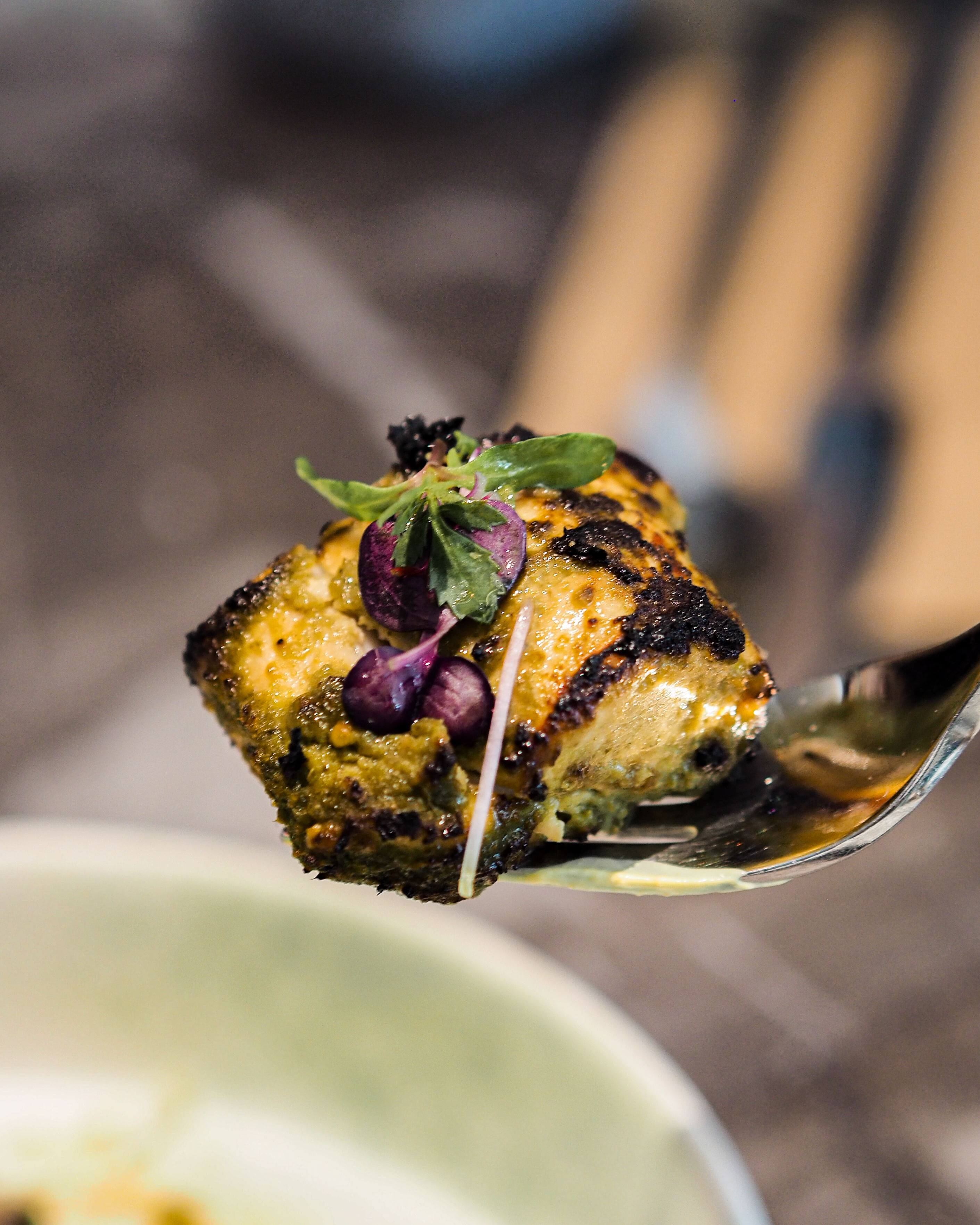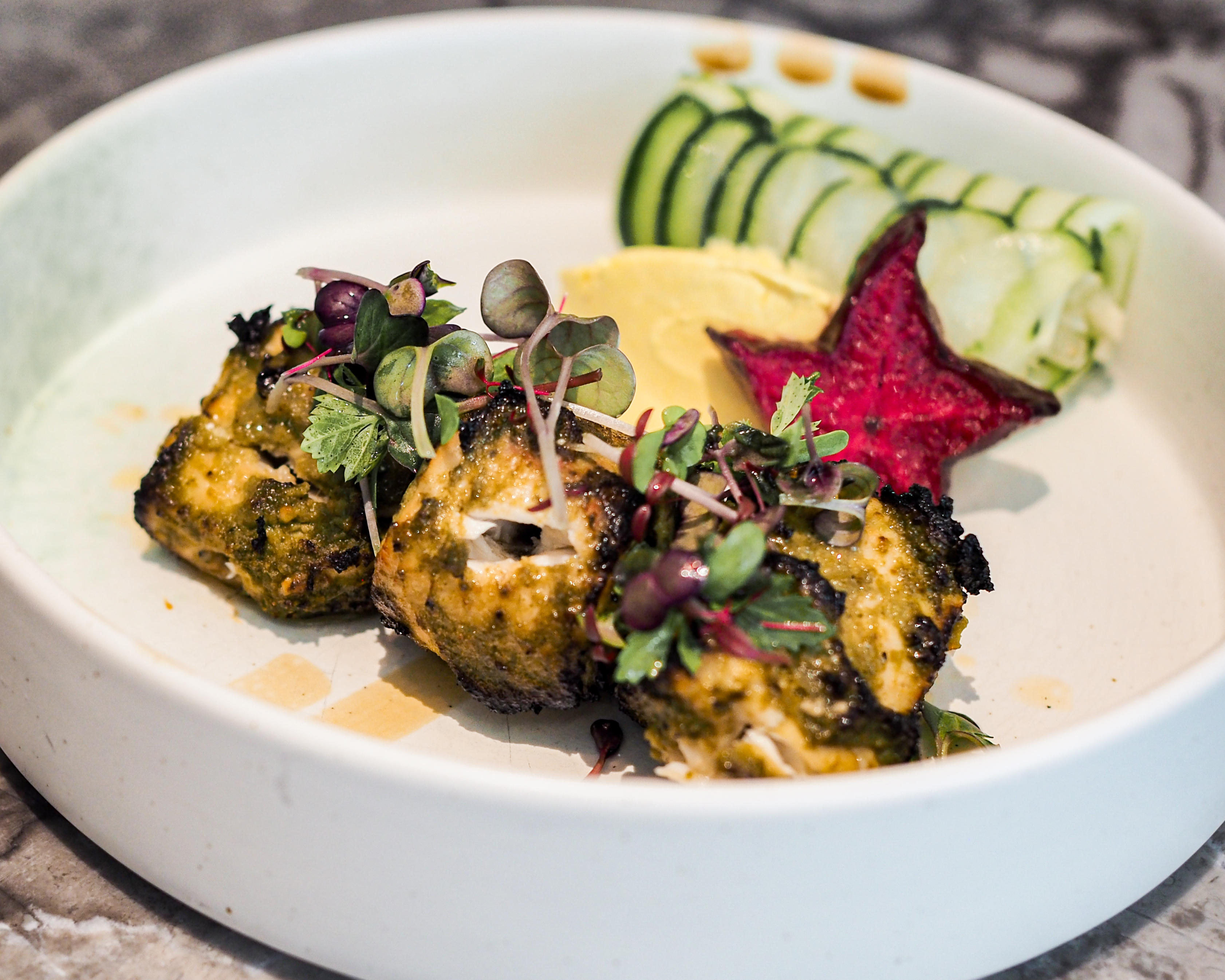 The fish was marinated in a blend of curry leaves, coriander and raw mango before being fired to smokey perfection. Mackerel is a firm, oily fish that stands up to a heavy marinade such as this one, and paired with the accompanying turmeric sour cream, lightly pickled starfruit and fresh cucumber, brought a light yet interesting flavour profile to the table.