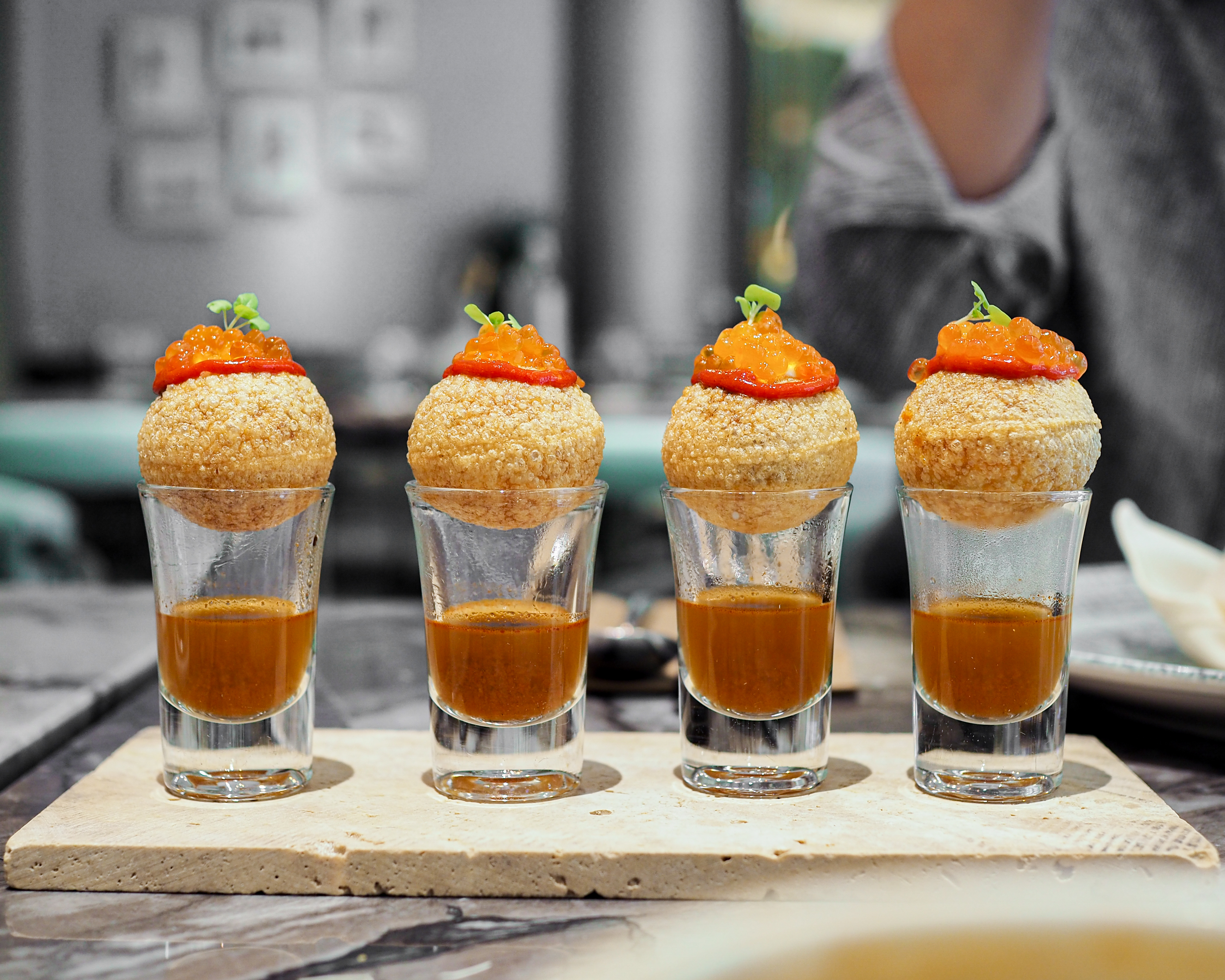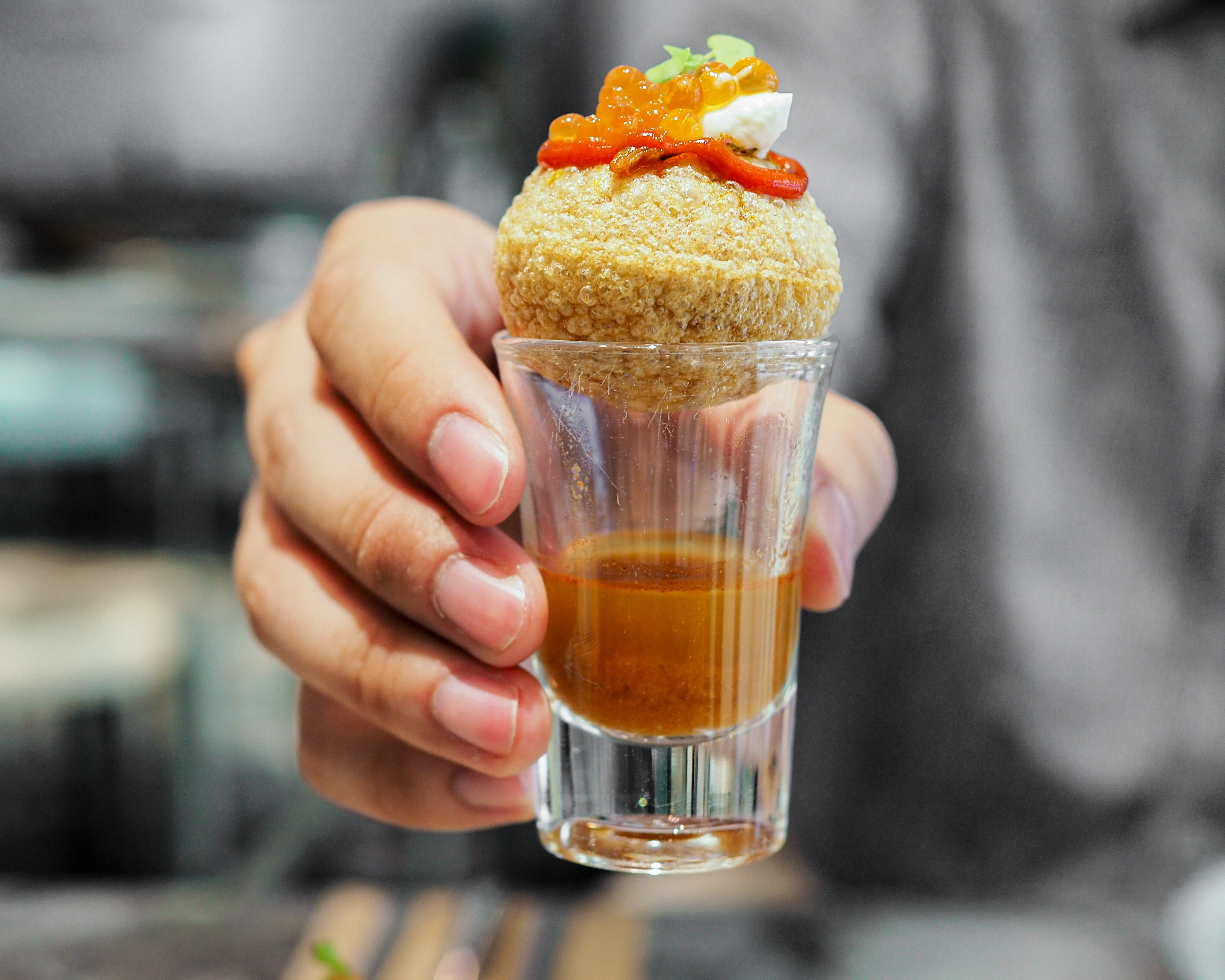 ABOVE Dahi Puri Shooters — Crab Meat & Crab Rasam