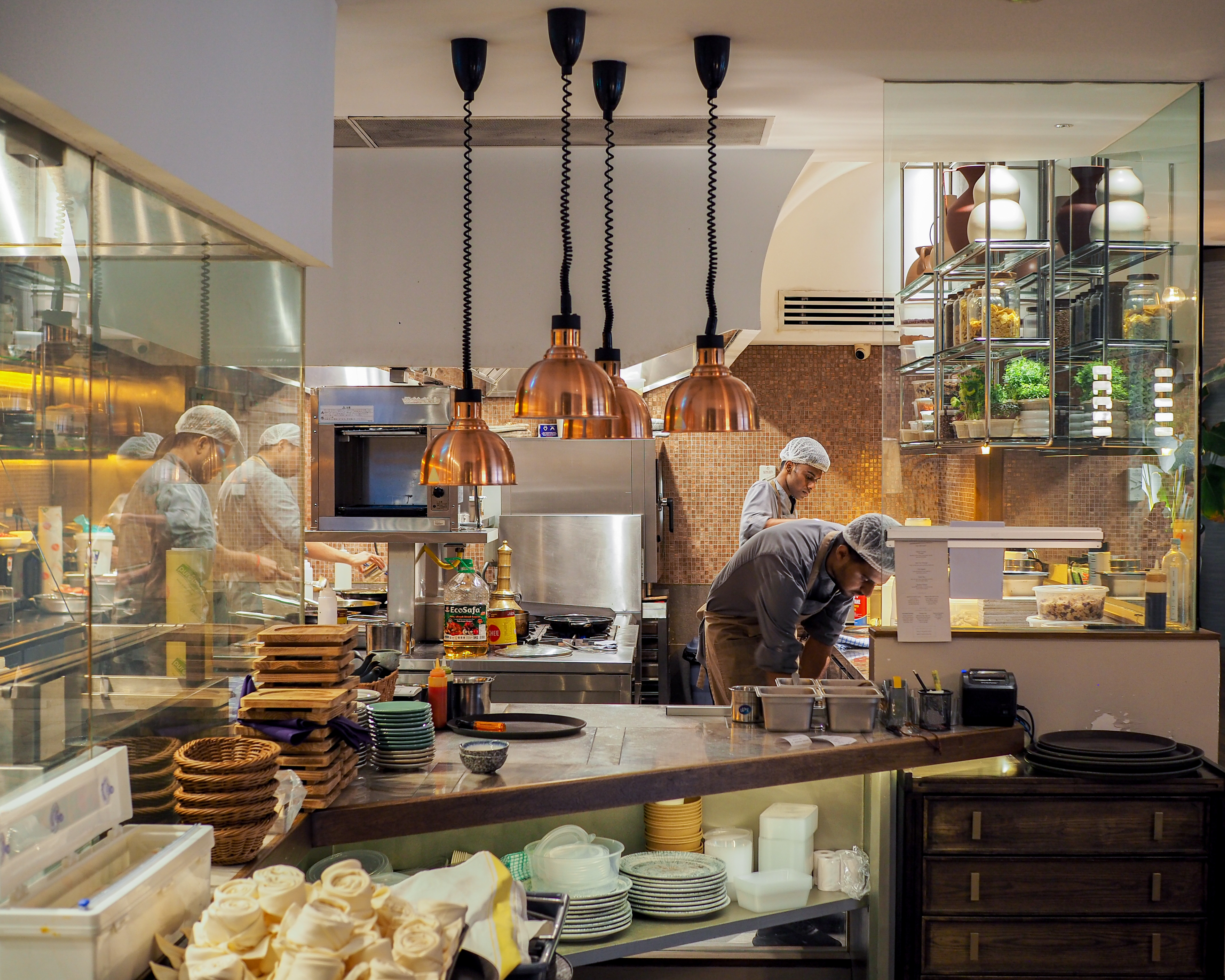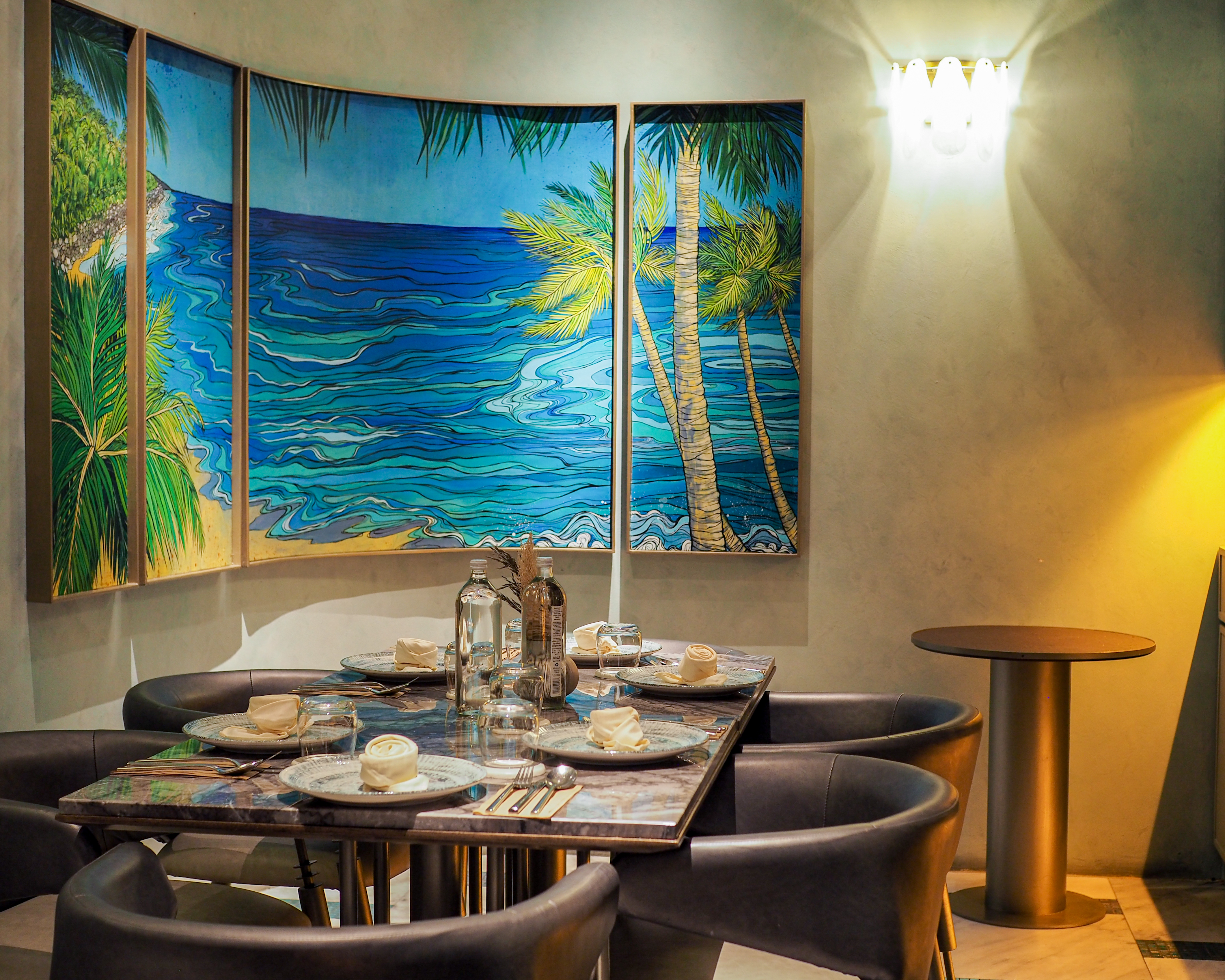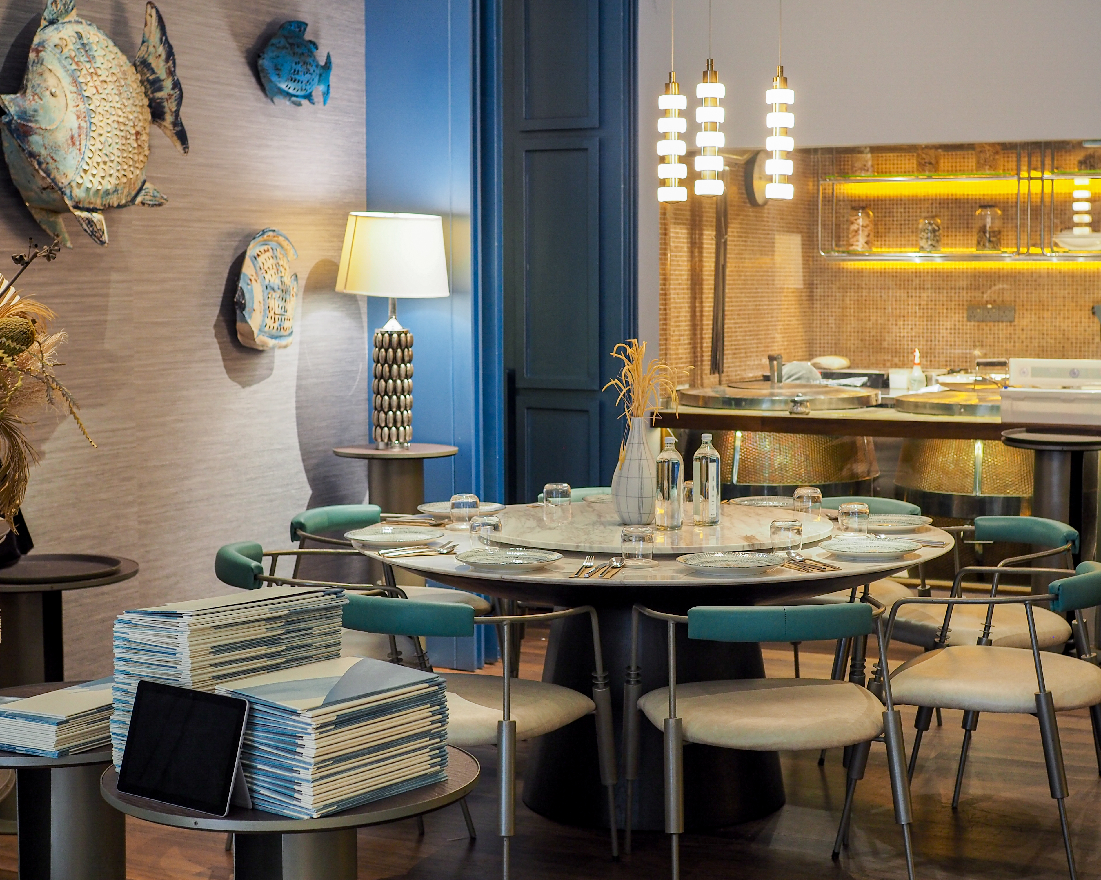Natural light from the skylight filtered in softly and the ambience was just right for light conversation over lunch, while the kitchen team was hard at work, seamlessly dancing around each other in choreographed concert. Hues of blue and gold accents permeated the space, subtly emphasising the coastal theme of the restaurant.
