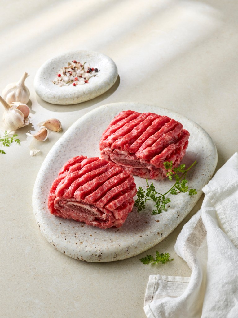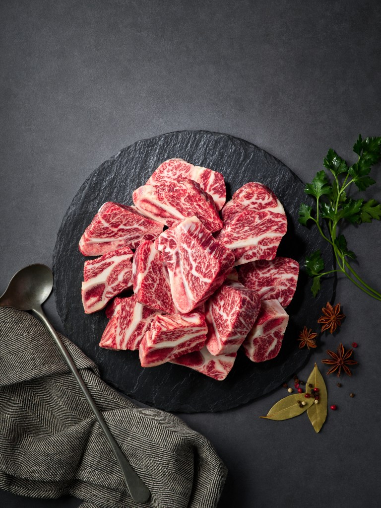 Hanwoo is a breed of cattle native to Korea, and is a smaller breed compared to other cows. Hanwoo beef is renowned for its exceptional quality, beautiful marbling and rich flavour. The melt-in-your-mouth tenderness and distinct chew is unmatched by other beef. The beef grading system in Korea is based on its marbling content: the highest grade, Grade 1++ has the highest level (22-24%) and Grade 1 (14-16%).