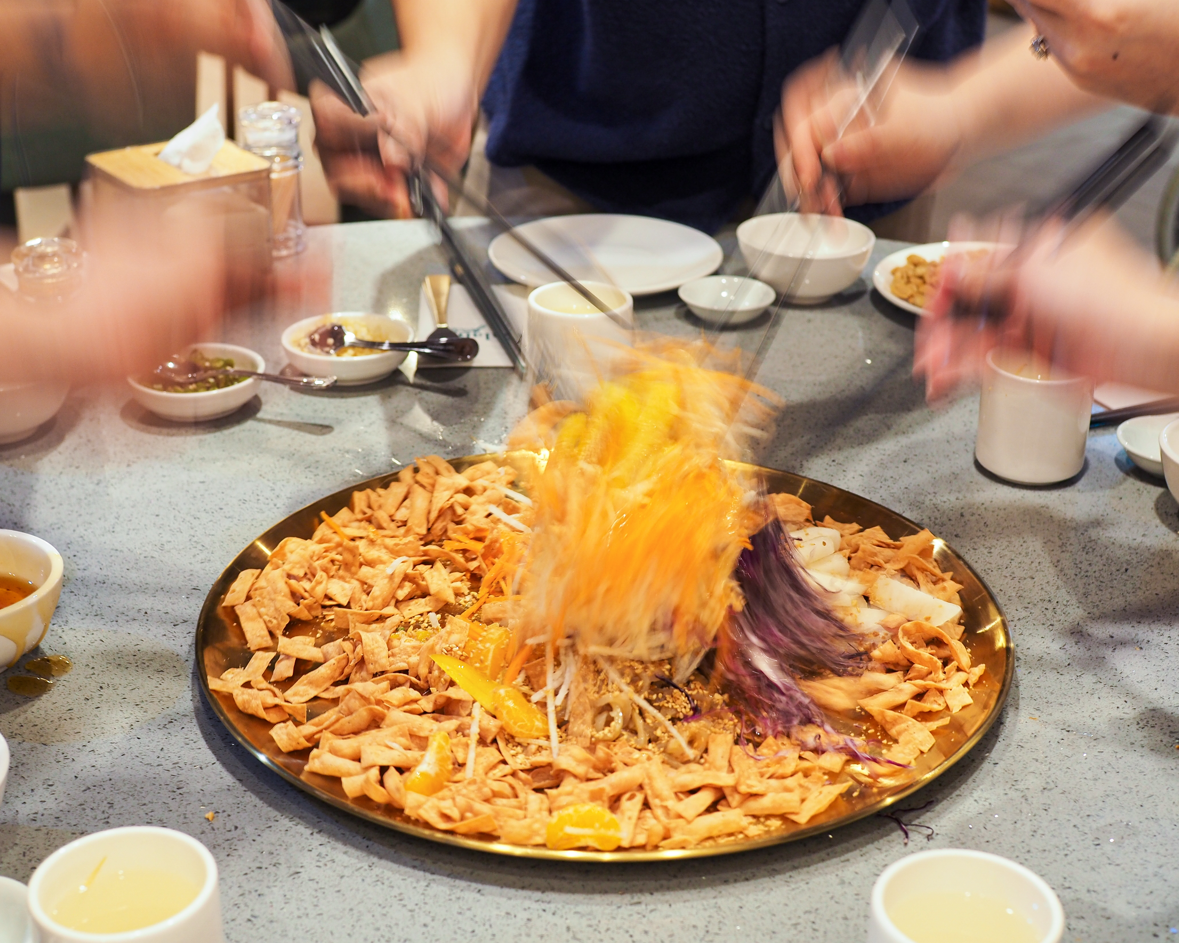 GalahGala’s Prosperity Yee Sang had some unusual toppings such as tangerine segments, julienned yellow peppers, red grapes and thick-cut jiçama batons accompanying standard components like seasoned jellyfish, wakame salad, cabbage and fresh salmon sashimi. Tossing everything with the sesame seeds and plum sauce brought both diners and dishes together.