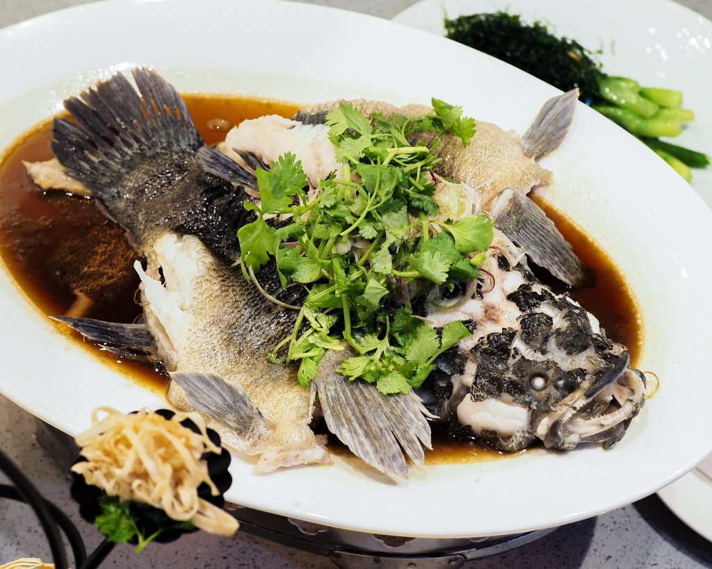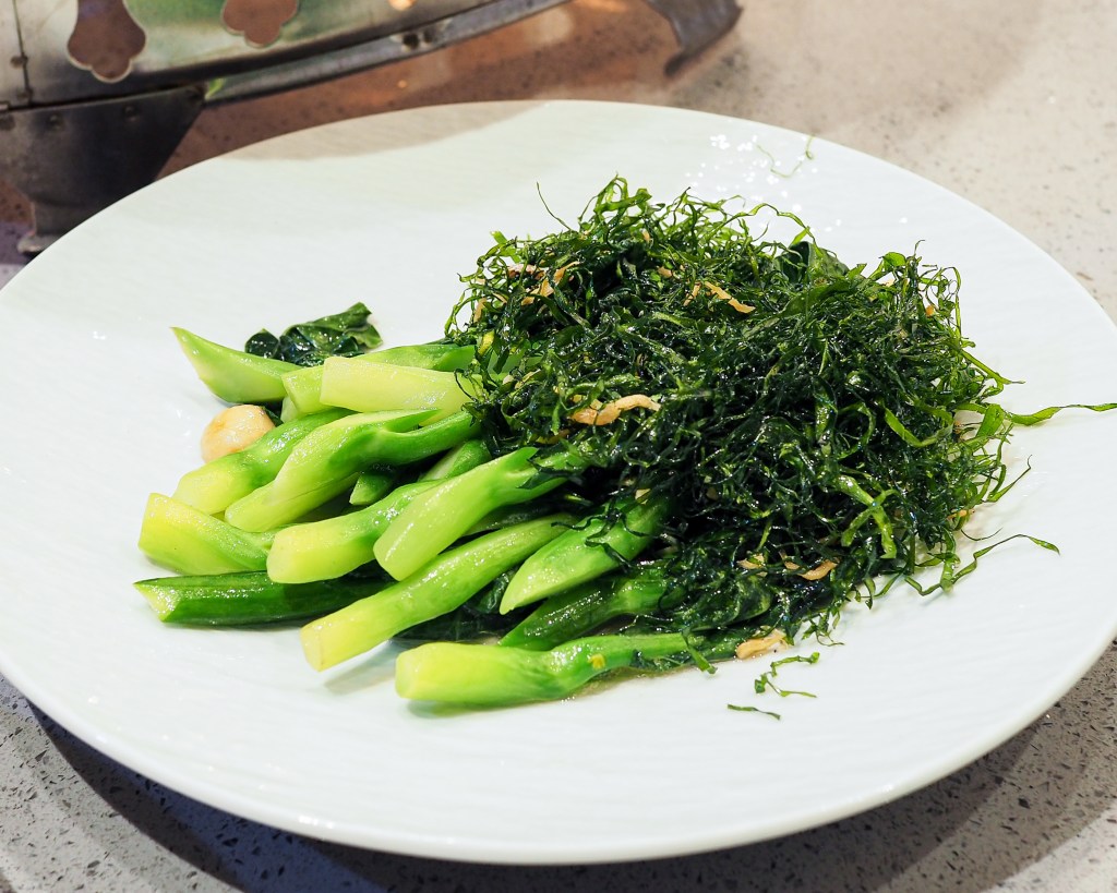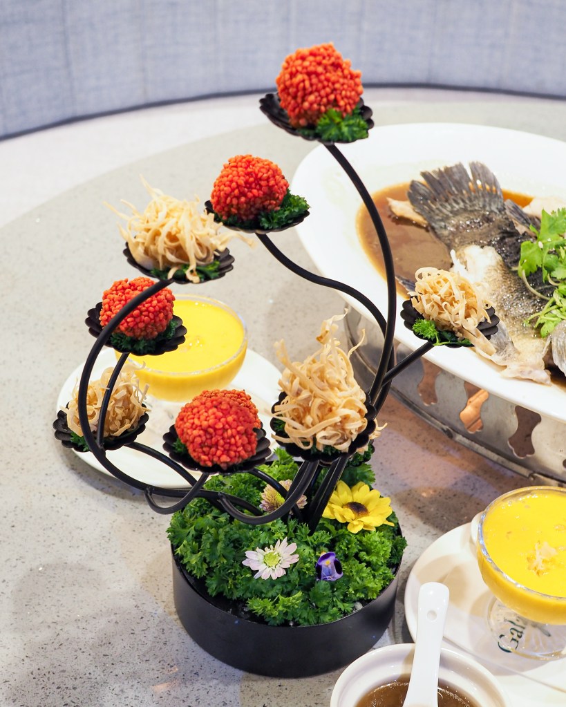 The restaurant is located on the first floor and offers a semi-outdoor or fully air-conditioned dining spaces. Bamboo and rattan accents complimented the shades of green and gold throughout the spaces. The interior design is heavily inspired by the ocean and fishing villages, with overhead pieces resembling waves and lampshades akin to fishing traps. Service was also top-notch, we were quickly escorted to our booth and settled in with a pot of chrysanthemum tea.