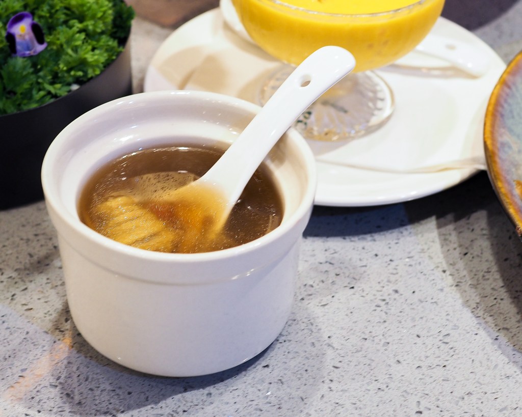 Soup is a must-have at every Chinese dinner. The double-boiled chicken soup here comes as a light broth with a deeply savoury flavour from the mushrooms and scallops, light yet nourishing at the same time.