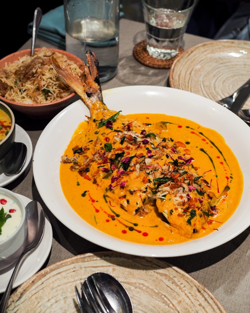 It landed like a centrepiece meant for celebration—a whole golden pomfret still steaming, its turmeric-stained Chef’s Special sauce casting golden reflections across the table. It was the kind of dish that draws phones, silences, and then conversation all at once. The fish itself was excellent—fresh, firm and flavour-packed complemented by the various textures and hues around.