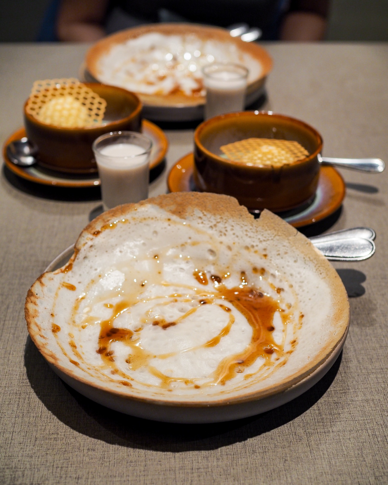 The meal concluded with a generous, lacy-edged Sweet Appam, its centre soft and slightly chewy, edged with crisp golden frills that shattered delicately on bite. The batter, gently fermented but not overly tangy, struck a pleasing balance—retaining that distinctive airy lightness without veering into sourness, as some versions can. It arrived with a pour of warm salted gula melaka and a side shot of coconut milk, encouraging a little tableside theatre as I drizzled it over the appam’s warm centre.