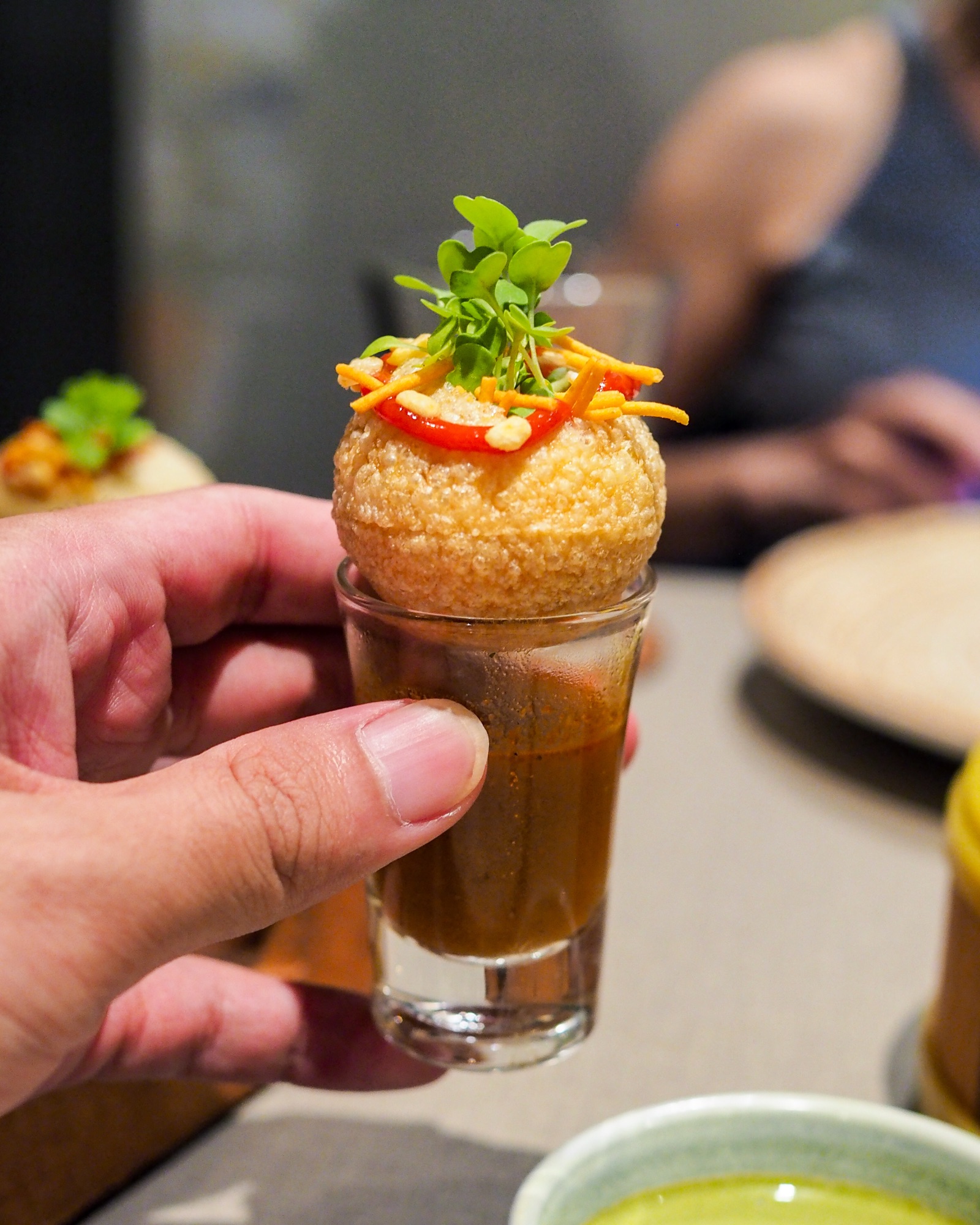 The menu kicked off with Kerala Dahi Puri, which are tapioca and rice balls served with tomato rasam shots. The crisp orbs were filled with a variety of crunchy bits like murukku and lentils, with a squiggle of special ketchup on top to add sweetness, tang and heat. Chase it down with a shot of tangy rasam.