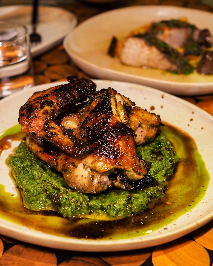 As the empty starter plates were quickly cleared, our (well quite literally the chef’s) choice of mains for the evening were the Andaliman pepper-spiced 1/2 Kampong Chicken accompanied by chimichurri with herbs from the garden, and the incredible Glazed Spanish Mackerel with umami scallop butter.