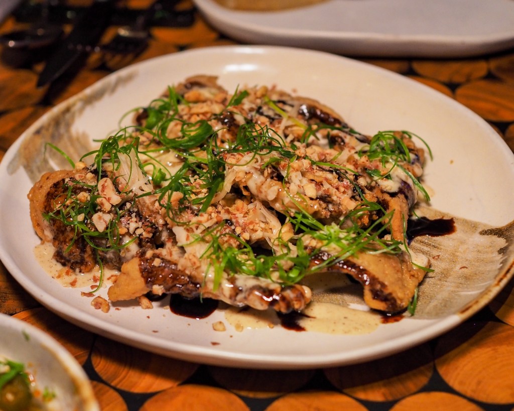 We had the excellent Fermented Cassava Bread with whipped mushroom “XO” butter; a moreish White Corn Relish with fermented snack peppers, pickled watermelon, and corn husk crisps; and my favourite Crispy Oyster Mushrooms dressed with coffee glaze and made interesting by way of long pepper.