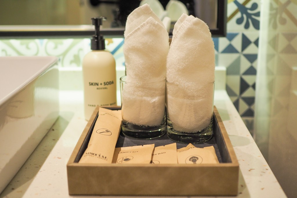 Taiwanese SKIN+SODA Revival bath amenities by Sun Life adorn the walls and vanity areas. I am unfamiliar with this brand but nonetheless enjoyed the scent and feeling of using the shampoo, conditioner, and body & hand wash.
