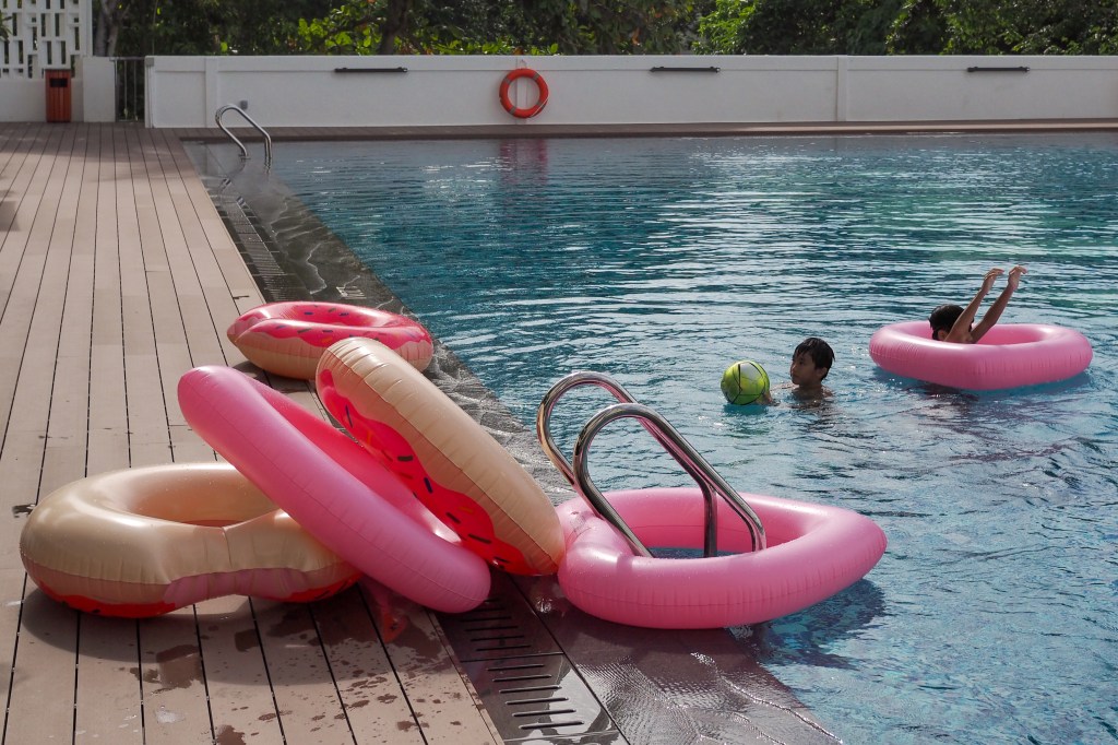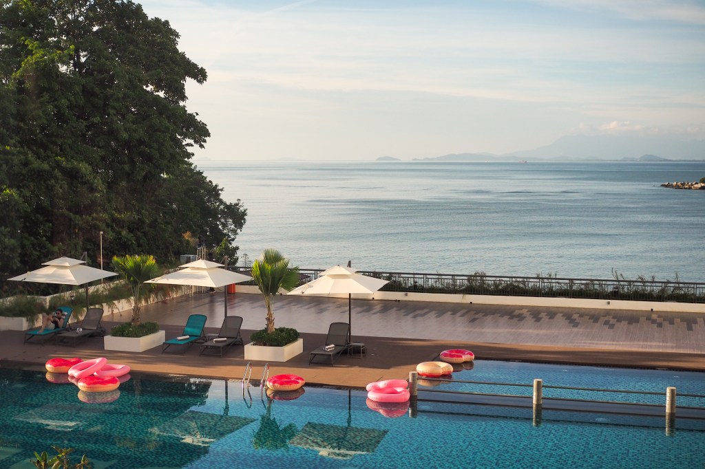 Striking pink ring floats and pool benches are available for guests to soak up the coastal Penang sun or catch the setting sun over the sea.