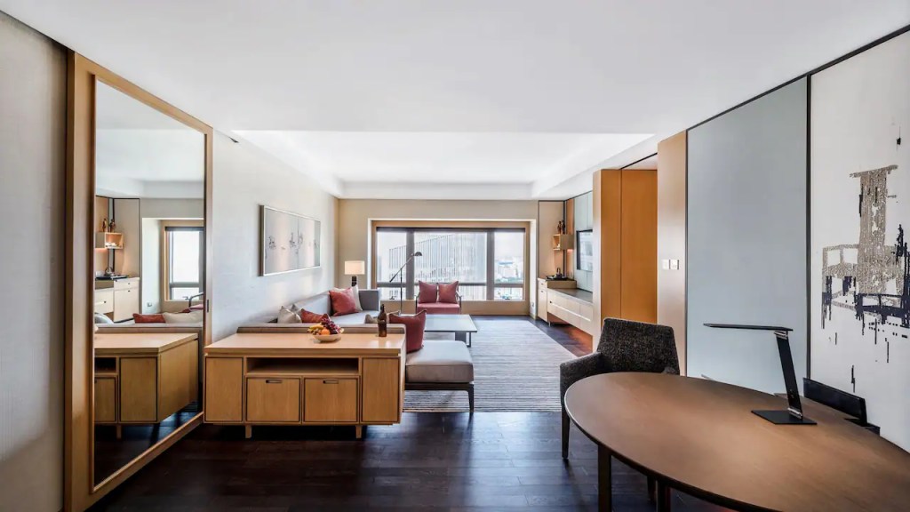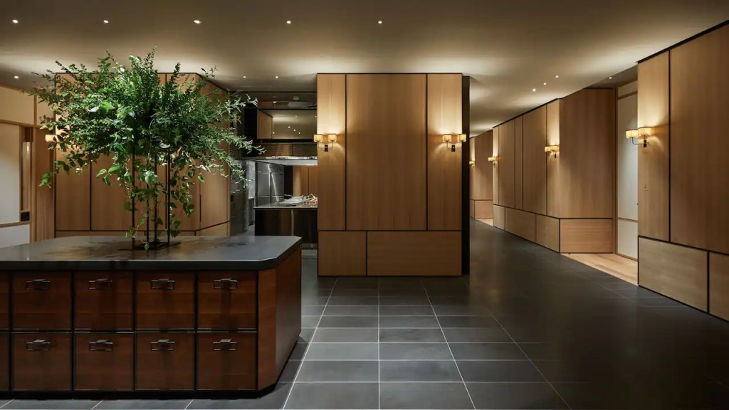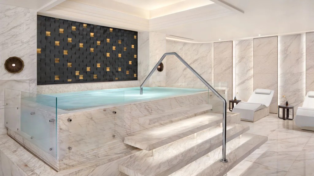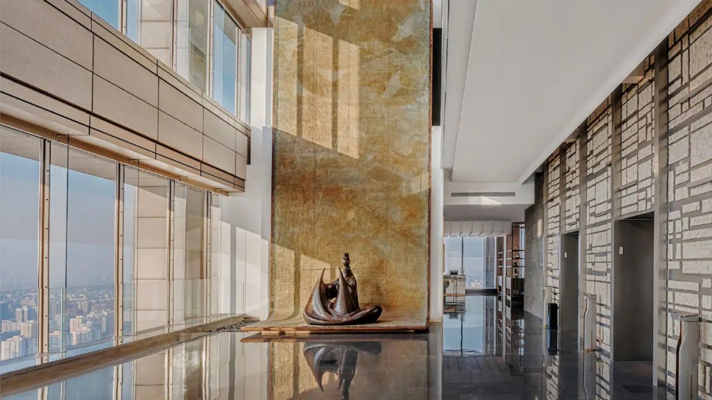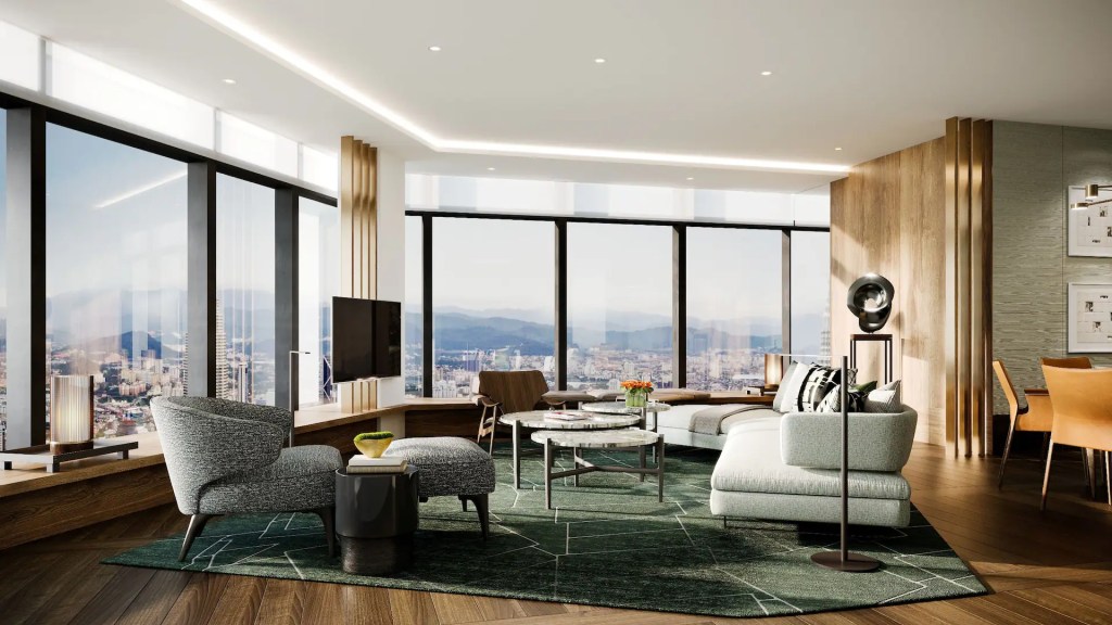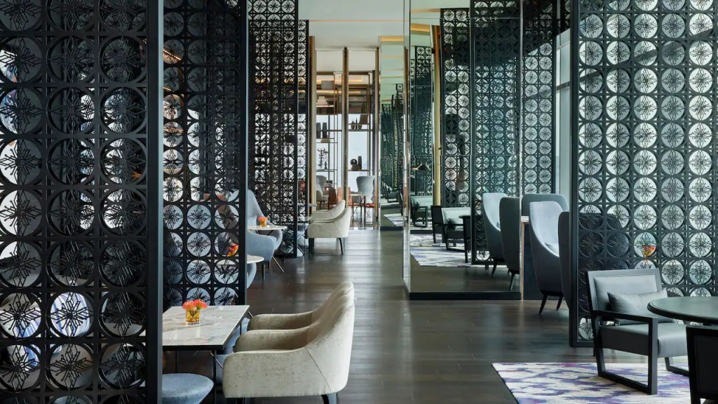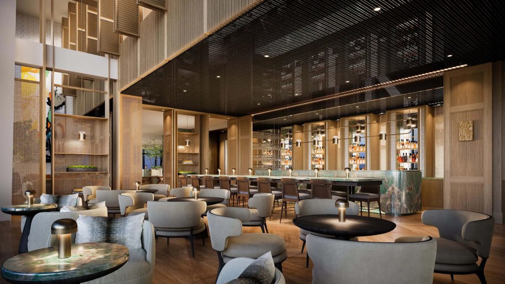 Designed by New York-based Tony Chi, the interiors lean into natural materials—stone, warm timber, and silk—tempering the sharp geometry of the city skyline outside.