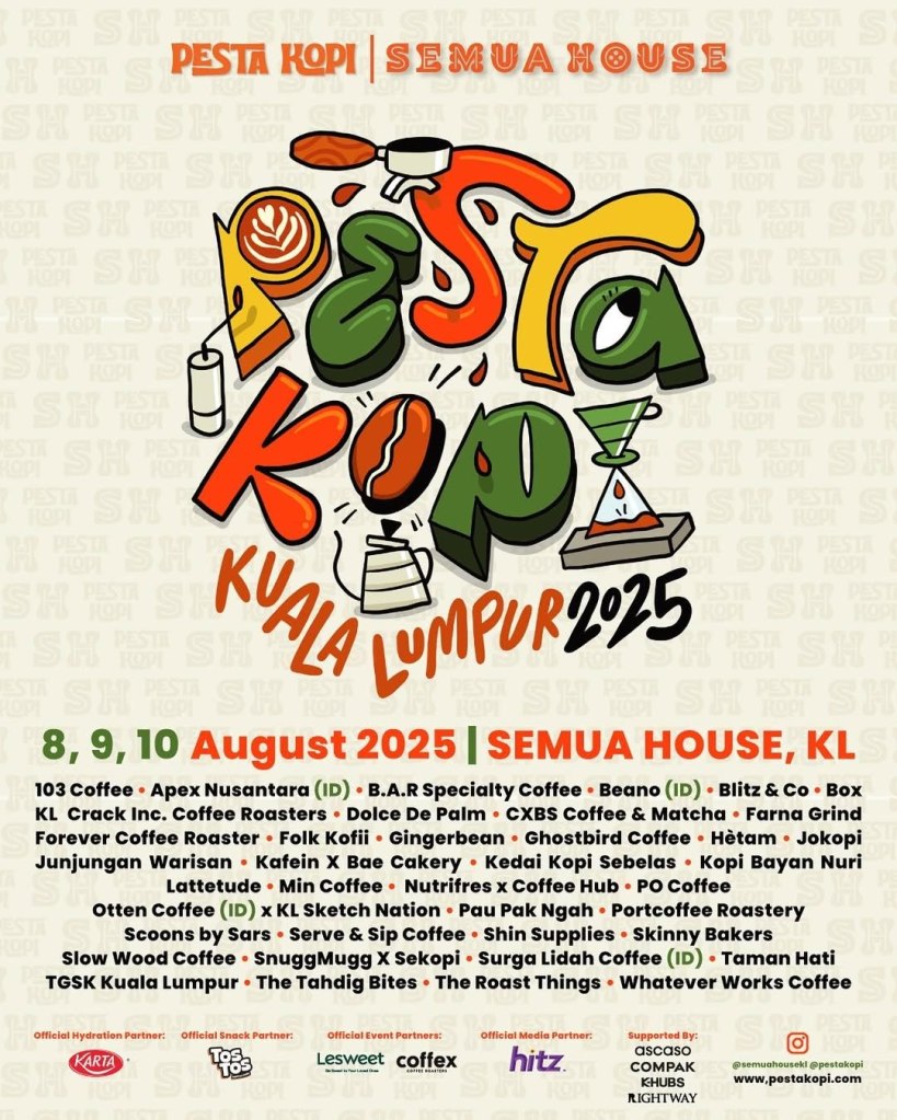 A three-day coffee festival unfolds in Semua House, offering a rare opportunity to see the regional coffee scene converge in one place. With participation from over 40 cafés, roasters, and baristas—including dedicated delegations from Indonesia—Pesta Kopi is a cross-cultural industry gathering with a casual, open-door format.