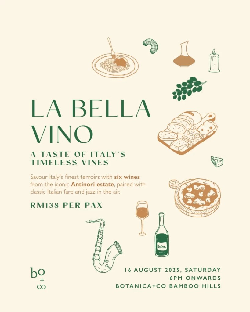 La Bello Vino is Botanica+Co’s dinner event dedicated to the art of wine pairing. This weekend draws on the Antinori estate, with a curated flight designed to mirror the progression of the evening’s courses. Expect generous pours, produce-forward plates, and the convivial energy that Bamboo Hills has quickly become known for.
