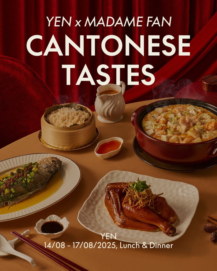 From 15 to 17 August, Madame Fan’s signature plates take over YEN’s kitchen in both set and à la carte formats—available for lunch and dinner on Friday and Saturday, and for lunch only on Sunday. Expect the polished precision that has defined Madame Fan’s reputation, now reinterpreted in the dramatic dining room of YEN, high above the city.