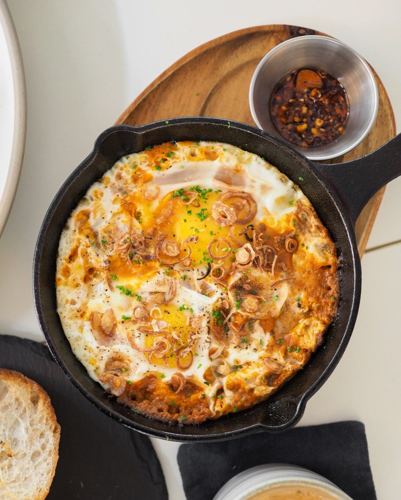 The Balado Baked Eggs (RM18) were served hot in a cast iron skillet. Whites were just set in an aromatic and lightly spicy tomato-based sauce, while the yolks retained their silky run. The pair of eggs were garnished with a generous handful of fried shallots and more chives, playing into the balado flavour profile of spices and alliums. While we were warned that this dish may be quite spicy, it turned out mild at most, which I appreciate. If you’d prefer a more fiery experience, the chilli crunch on the side is packs quite the Scoville rating.