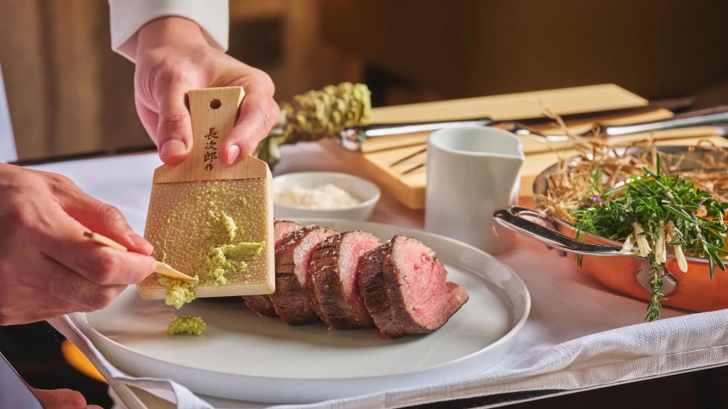 Understandably, the following course could not eclipse the salmon. The 7 Days Dry Aged Chateaubriand (RM799), however, was still excellent in its own right. A princely 400g slab of Australian Goulburn Valley beef was carved tableside. I noticed the knife struggling slightly and wondered if the steak would be too rare, but the cut revealed a deep, even pink that confirmed a proper medium rare. The sauces that accompanied it ranged from striking to forgettable. A fermented green pepper sauce carried exotic notes reminiscent of long pepper I once tasted at AIR CCCC in Singapore. The béarnaise was rich, almost to the point of cloying. The green nam jim and sherry vinegar jus were pleasant but not memorable. In place of traditional horseradish, the restaurant offered fresh grated wasabi that delivered an unmistakable pungency, the kind that clears the senses and cuts through fat with elegance. The truffled Yukon Gold mashed potatoes, despite the promise of their description, were good but nothing extraordinary. A sprinkle of flaked salt turned the steak from good to great almost instantly, reaffirming what I have always believed: most steaks need little more than salt to be extraordinary.