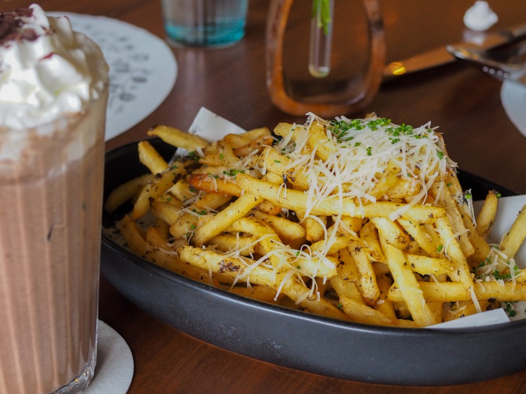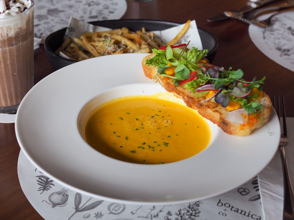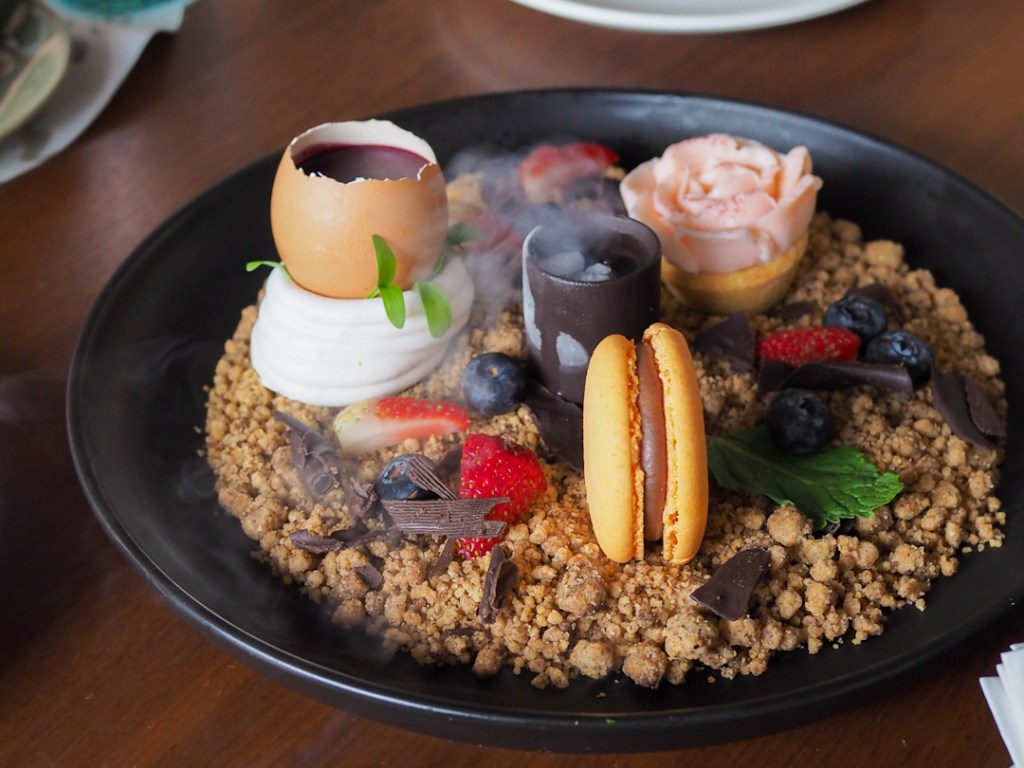 Lunch at Botanica+Co closed the stay. The truffle fries made their triumphant second appearance, joined by carrot soup with a beautifully toasted slice of bread, Pesto Spaghetti, and the excellent Pulled Lamb Panini with its delicate ciabatta and yoghurt-enriched filling. For dessert, we opted for A Taste in Bloom — a whimsical trio of petit sweets presented atop hazelnut crumble with a dry-ice plume. Probably not the best dessert on the menu, but playful and memorable.
