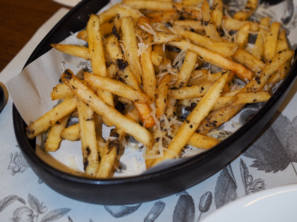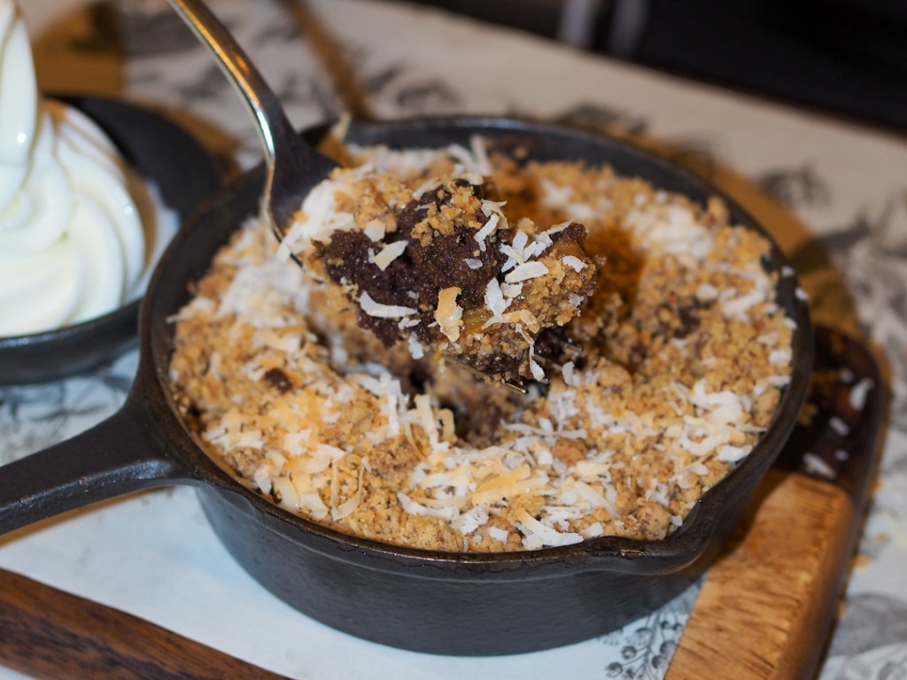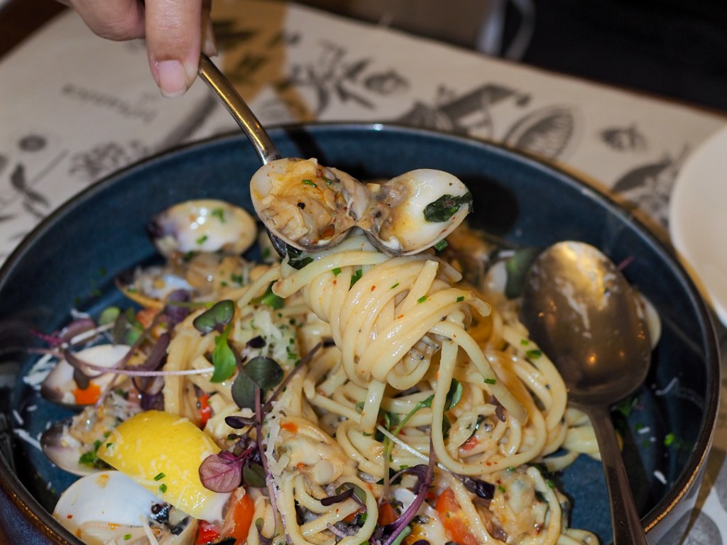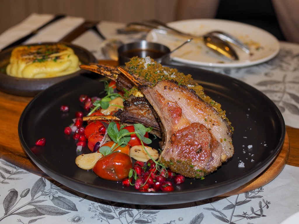 The Alila Truffle Fries, a signature in their own right, arrived first — tossed in truffle paste instead of oil, speckled with intense black flecks and finished with a coarser grating of cheese. They were devoured almost instantly, and I quietly vowed to reorder them the next day. Clam Linguine came next, a fragrant tangle of garlic, chilli and olive oil, emulsified just enough to cling beautifully to each strand, the pasta flanked with plump Manila clams. The Crusted Lamb Rack, four rib chops with a mustard-herb crust, arrived with blistered tomatoes, confit garlic and ruby pomegranate seeds. It was a hearty dish with a tender blush, though some parts leaned fatty. Dessert — the Melaka Pineapple Crumble with vanilla soft serve — was warmly spiced, coconut-forward and comforting, though the pineapple-to-cake ratio tipped slightly off balance.