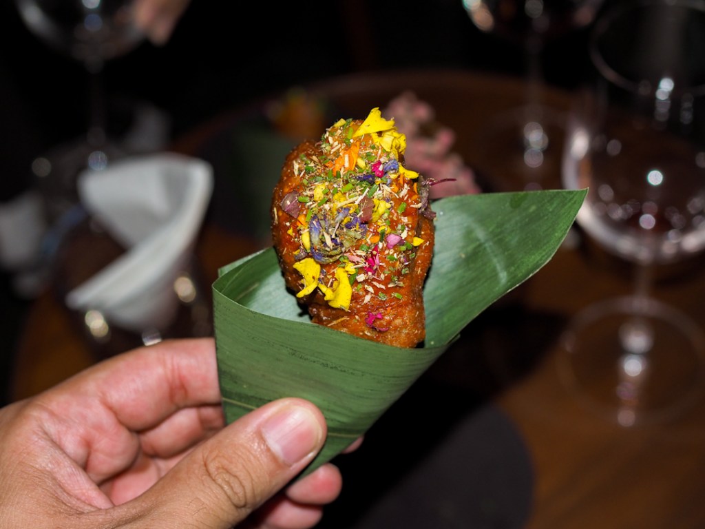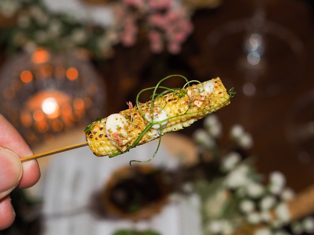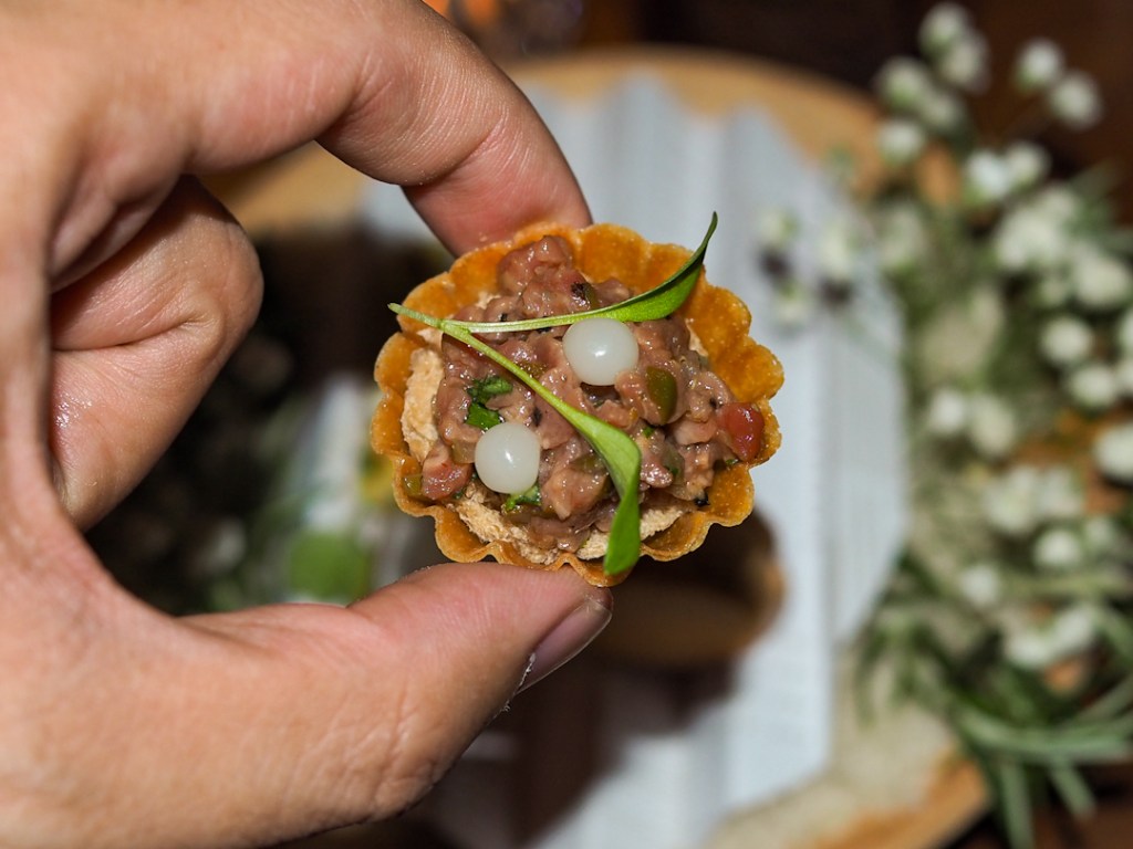 The first pour was a bright Soalheiro Rosé with an inventive savoury cheesecake canapé layered with cheese and sable. The next trio of canapés arrived on folded paper waves accented with blue baby’s breath — a salmon rillette sable sandwich, a beef tartare tart and a baby corn skewer.