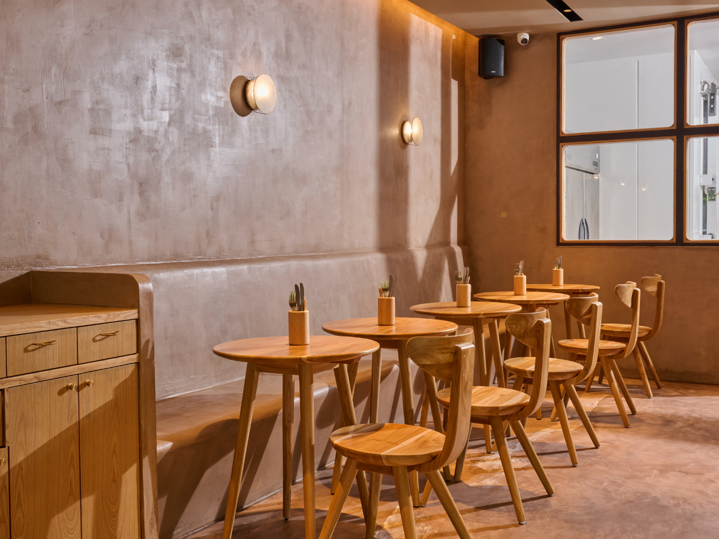 The interior leans into a contemporary Japanese language without being fully Japandi. Earthen textures and rustic concrete soften the geometry of the room, while the warm glow of washi paper bracket lights crafted by Yasuaki Yoshimoto adds a gentle diffusion that makes every surface feel touchable. If not for the impressive cake display in the centre, kotsu kotsu could easily pass as a spa sanctuary. The pastry chefs maintain a quiet presence throughout, working with a kind of deliberate inconspicuousness that contrasts with the theatrics often seen in teppanyaki counters or omakase rooms.