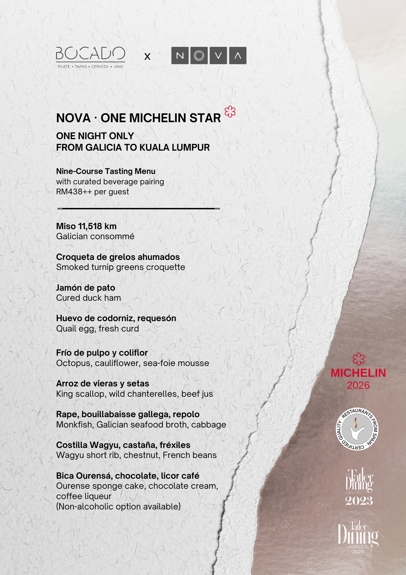On Friday, 13 March 2026, this specific culinary coordinate arrives in Kuala Lumpur as Nova, the Michelin-starred jewel of Ourense, takes over the kitchen at Bocado for a singular, one-night-only engagement.