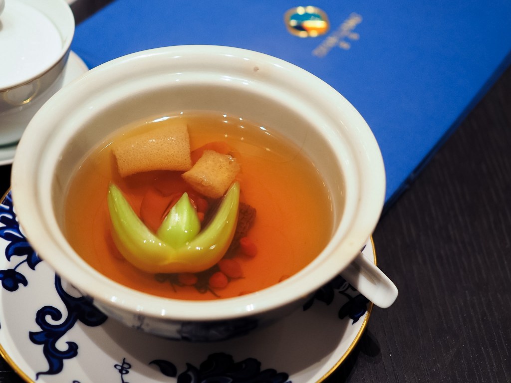 Zhan Liang is Rosewood Phnom Penh’s pan-Chinese restaurant, spanning Cantonese, Sichuanese and Northern Chinese styles in one of the most extensive menus of its kind. Chef de Cuisine Teng Kam Seng—a Malaysian Chinese chef with over 25 years of Cantonese experience—helms a menu that traverses China without losing its footing. As a fellow Malaysian, finding one of our own behind one of the most accomplished Chinese kitchens in the region was quietly gratifying. We were seated in the VIP private dining room around a table for twenty, a motorised lazy susan turning slowly at its centre.