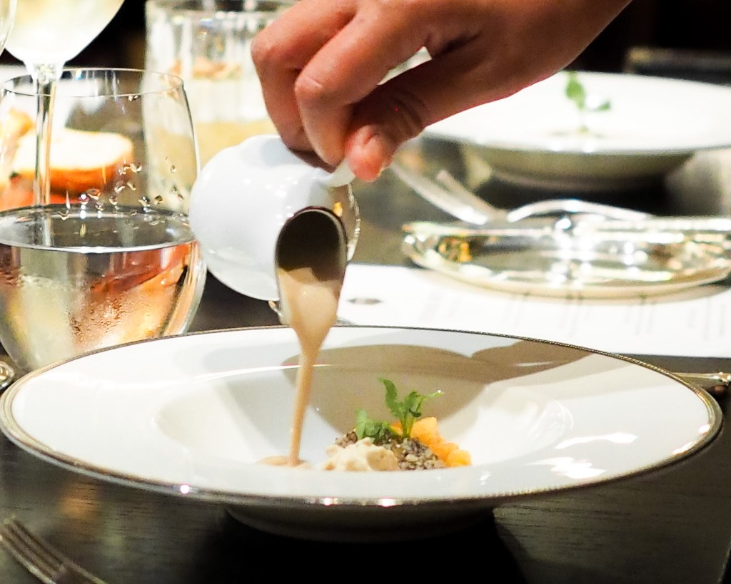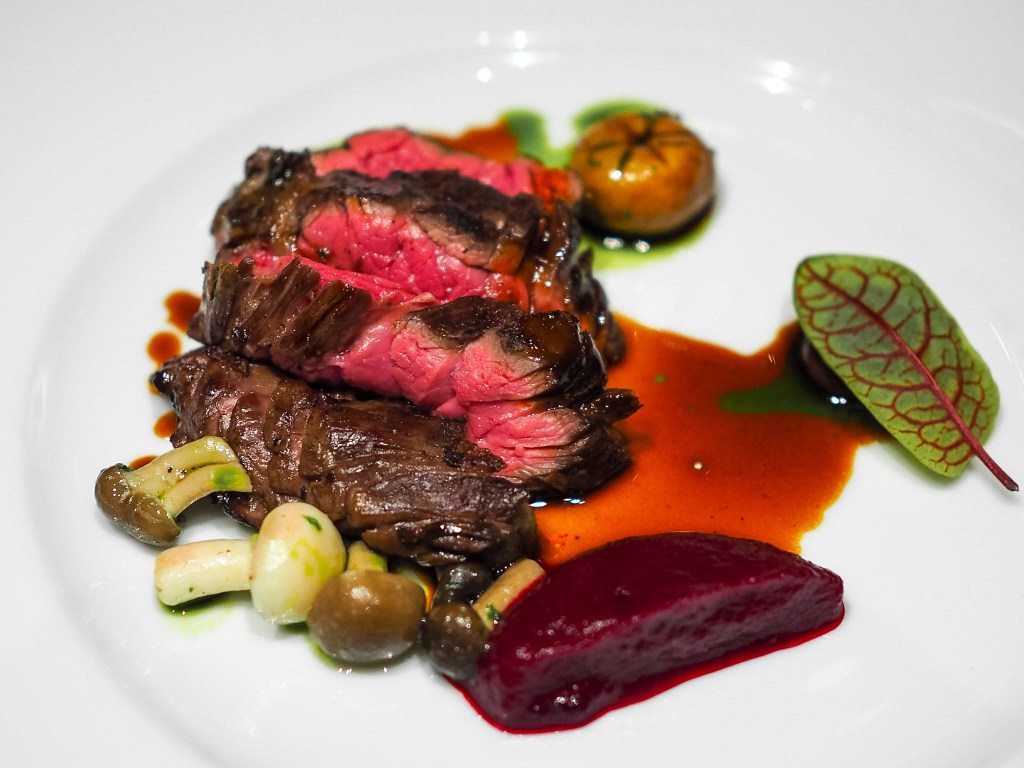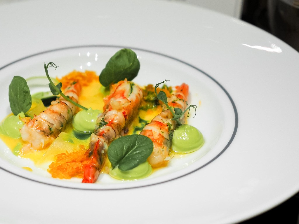 The bread service arrived first: freshly baked loaves with house-made salted butter in handcrafted wooden boxes. I helped myself to considerably more than was reasonable and have no regrets. A steak tartare pai tee offered a clean opening bite before the truffle mushroom soup poured tableside over mushroom jam—earthy, savoury, lighter than its rich visuals suggested. I deeply enjoyed the garlic butter roasted shrimp with fermented lemon purée and green oil: extraordinarily fresh, a firm resistance to the knife, and a bright acidic pop that made the whole thing sing.