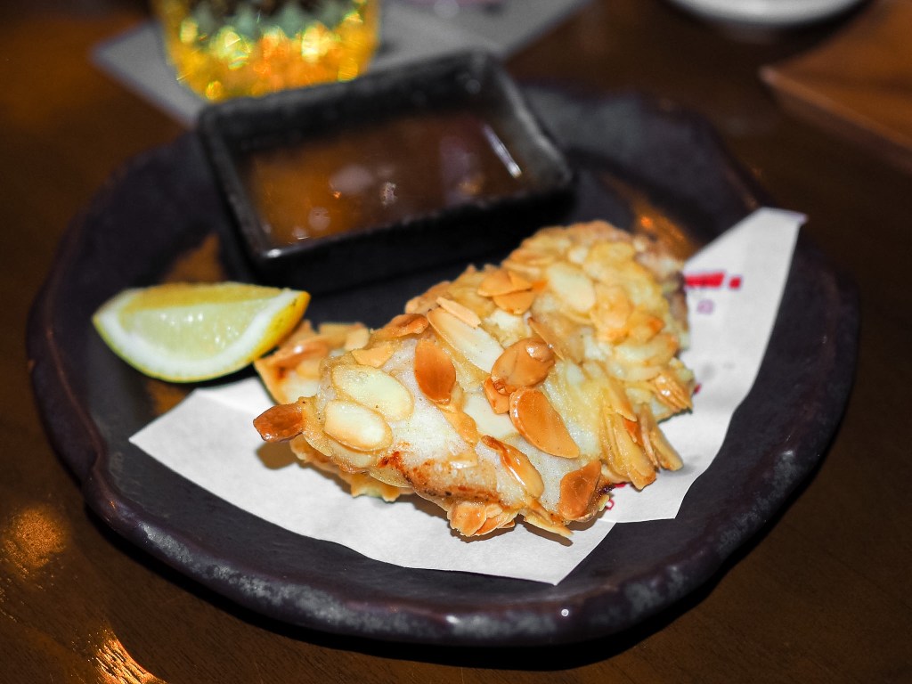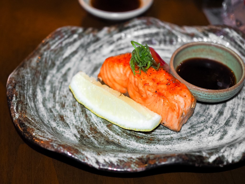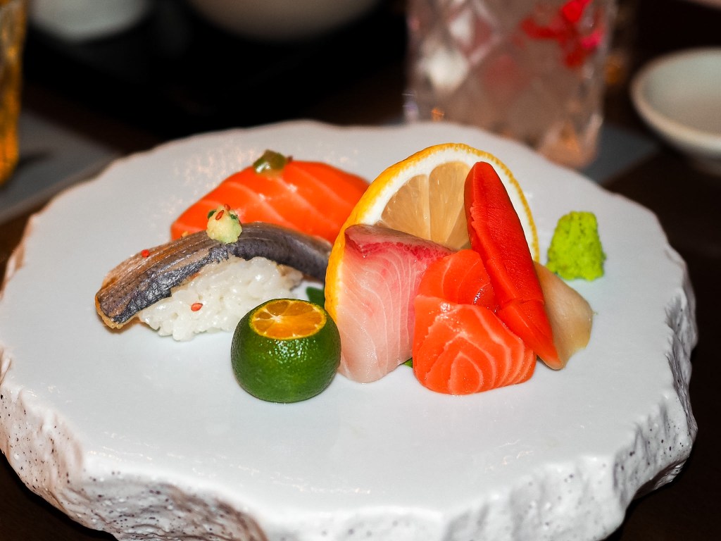 The tuna tataki with garlic chips and yuzu ponzu: silky, medium-fatty, melting cleanly; hata tempura—grouper in a batter enriched with almond flakes—was the evening’s most technically interesting moment, adding a rustic crunch I had not encountered in tempura before. Sushi and sashimi moriawase was fresh and well-sourced, the kohada nigiri and hokkigai sashimi were the most memorable. An interlude with hotate dashi broth and a generous salmon fillet glazed with teriyaki sauce completed the meal. The meal closed with a strawberry daifuku and red bean monaka.