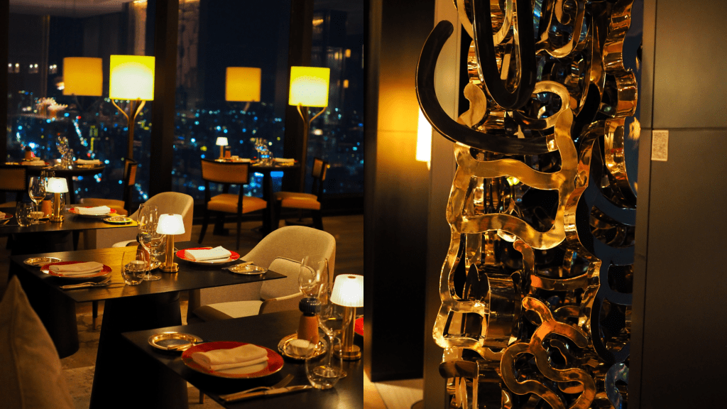 Cuts occupies Level 38 with floor-to-ceiling city views, a kitchen philosophy built around whole-animal butchery and the hotel’s own hydroponic garden, and a wine programme of serious depth. By the window, a bronze sculpture composed entirely of the Cambodian alphabet watched over our dining party. Cuts is also home to a Wine Vault with over 3,000 bottles of exquisite and some very rare labels.
