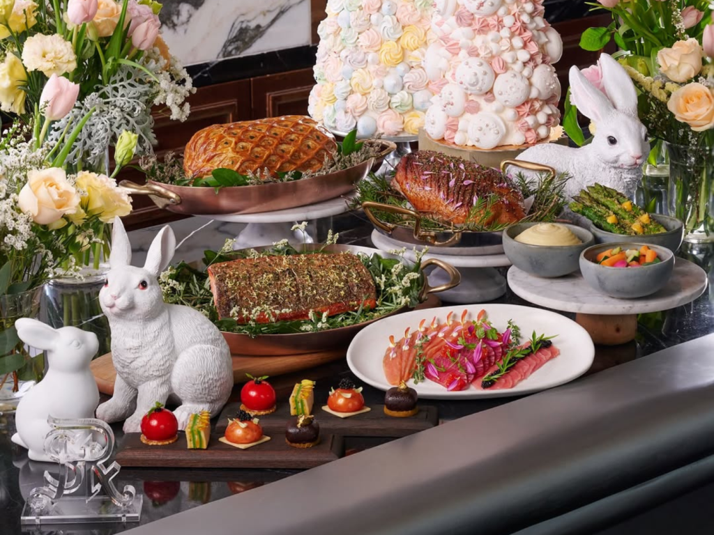 The Eggstravaganza Easter Lunch Buffet at Shangri-La spreads across Lemon Garden Cafe, Lobby Lounge and Garden Room. The experience features roast leg of lamb, a Wagyu Carvery, fresh seafood on ice, and a Parmesan Wheel Pasta Station. For local nostalgia, The Lobby Lounge presents kaya toast, laksa, and ABC; while the Garden Room steps into more refined territory with foie gras parfait with rose petal jam, truffle crème brûlée, and elevated selections. Live music plays from 12:30–2PM. The Grand Easter Kid’s Corner runs in the Main Lobby and Shangri-La Garden, two Easter Egg Hunts, face painting, balloon sculpting, egg painting, and bunny mask colouring.