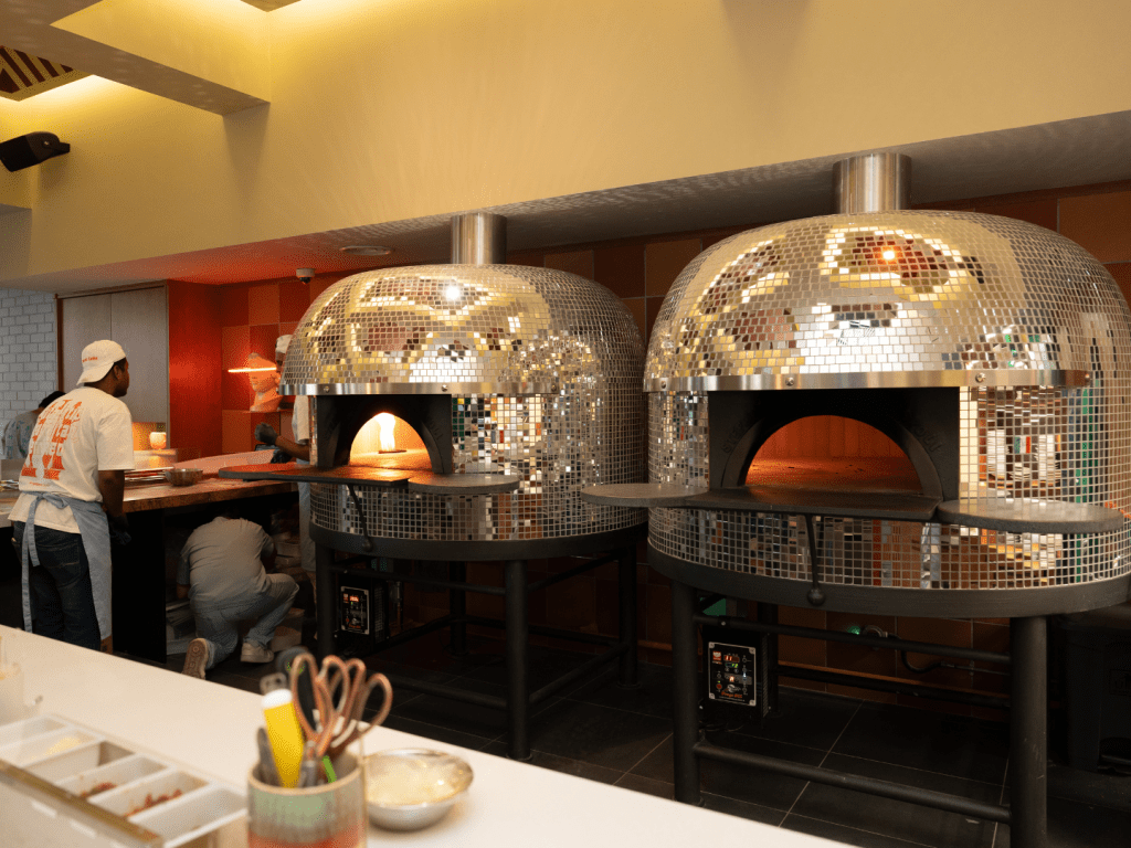 At the centre of the room are the two Stefano Ferrara Forni ovens, handbuilt in Pozzuoli just outside Naples, making Pizza Duo The Campus the first pizzeria in Malaysia to feature a pair of them. Stefano is a third-generation craftsman whose family has been building these ovens by hand for some eighty years. Da Michele in Naples uses them. Franco Pepe uses them. Here, they anchor the open kitchen like twin disco balls, and every seat in the house has a sightline to them.