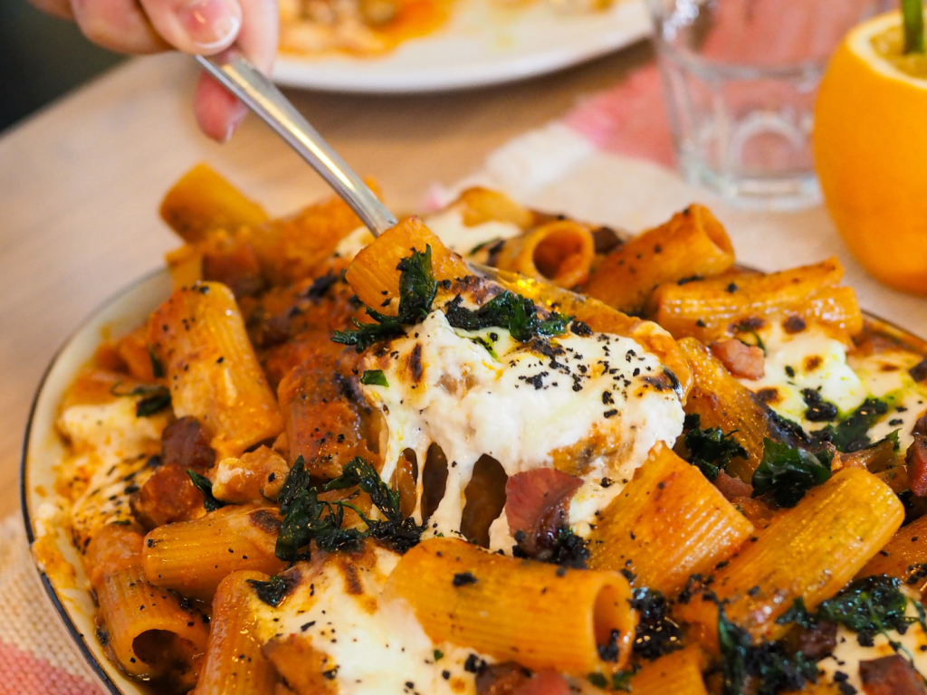 Better still is the Spiced Duck Sausage Rosa with Rigatoni. Rich, savoury, and deeply cheesy, finished with a layer of stracciatella from Naples baked directly onto the top. Duck sausage appeared in cubes like bacon lardons, toothsome and tender at once. The sauce carries the simple confidence that comes from careful sourcing. Pizza Duo uses only high-quality tomatoes—the same San Marzanos that form the backbone of every pomodoro base—and the payoff extends everywhere the sauce goes. This is a dish I would order again without thinking about it.