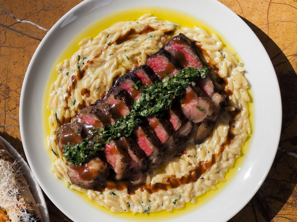 The Wagyu Sirloin with Orzo was a special plating that afternoon, substituting wagyu for the menu’s regular black angus. A steak dish is largely a function of the meat itself, and the angus is perfectly good on its own terms. What carries this plate is the orzo—creamy, built on what tastes like an alfredo base cut with beef jus, finished with a herbaceous, slightly acidic gremolata that lifts the whole thing out of richness and into balance.