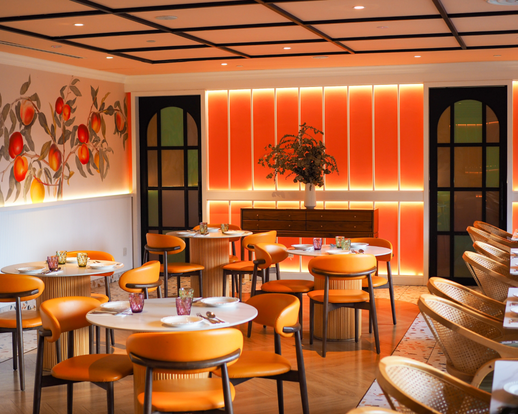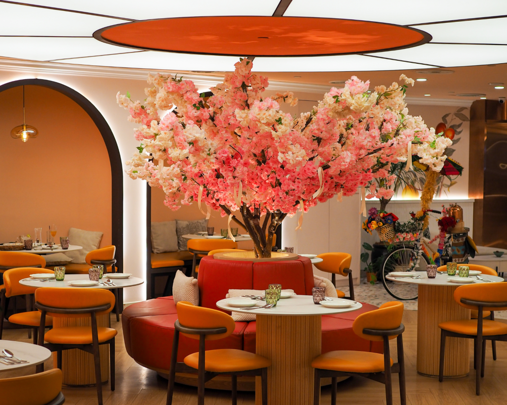 In the Lounge, a seasonal tree installation dressed in pink blossoms dominates the circular room, conjuring a lightness wholly disproportionate to its distance from any natural light. The overall impression is a long afternoon somewhere along the French Riviera— warm, unhurried, faintly giddy—the kind that begins with a Bellini.