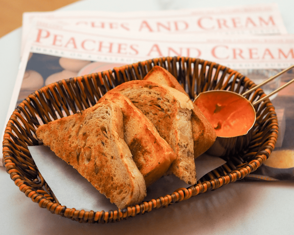The Bread Basket (RM19) is where Peaches and Cream makes its first declaration. Two varieties, one seeded and one closer in spirit to a shokupan or brioche, are baked in-house. Both arrive hot and springy, with a tight moist crumb that holds its texture under the weight of an extremely generous application of butter. The esplette chilli butter alongside is worth its own moment: piment d’Espelette is a PDO-protected dried chilli from the Basque Country, mildly warm, its flavour sitting somewhere between sweet smoked paprika and something more aromatic. Here, it is deeply fragrant and luxurious.