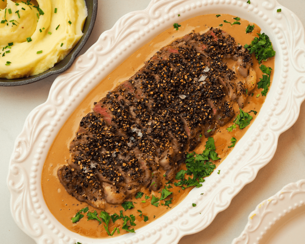 The steak was where the afternoon peaked. Two hundred and fifty grams of Black Angus Sirloin, the fat cap rendered to a glossy, yielding finish, sliced thick, served with a black pepper au poivre that coated each bite with gentle assertion. There were occasional encounters with sinew, small interruptions in an otherwise generous well-rested cut. The mash was the right companion: silky, butter-enriched, faintly aromatic with garlic in the continental fashion. Though it must be said, the steak frites—the version with the fries and the au poivre uninterrupted by other dishes—is almost certainly the platonic form of this meal. I’ll be back for that.